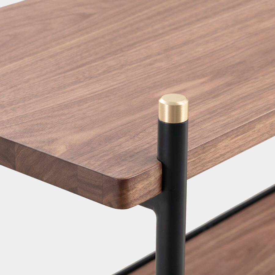 Stilren hylla i serien Carlyle, med hyllplan i valnötsfanér och svart pulverlackade metallben. Diskreta mässingsdetaljer ger en sofistikerad finish. Perfekt som avlastningsmöbel i hall, vardagsrum eller kontor.