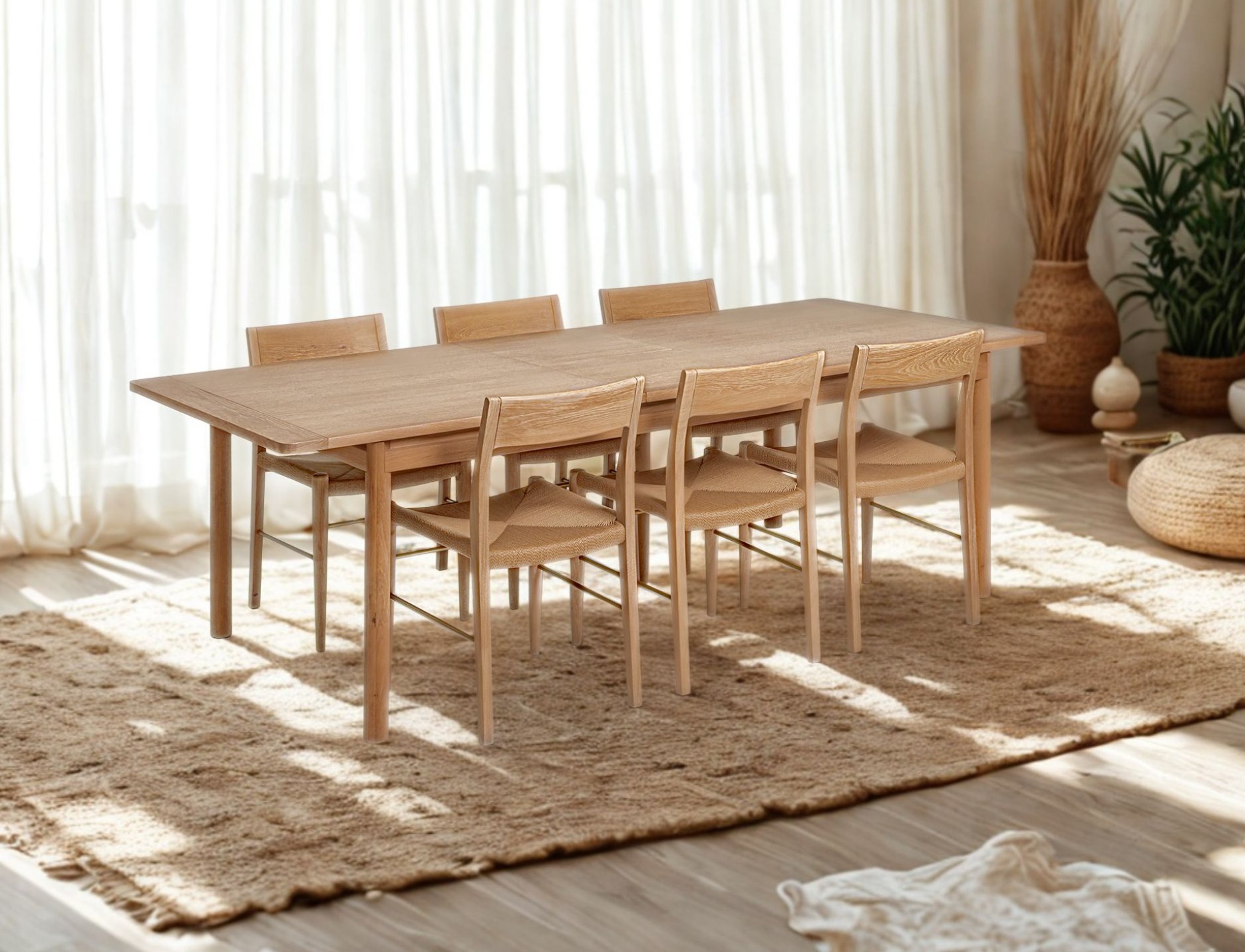 Detta eleganta matbord kombinerar stilren estetik med praktisk funktion. Tillverkat i massiv vitoljad ek, erbjuder det en naturlig och hållbar yta som framhäver träets vackra struktur och ger en varm, inbjudande känsla.