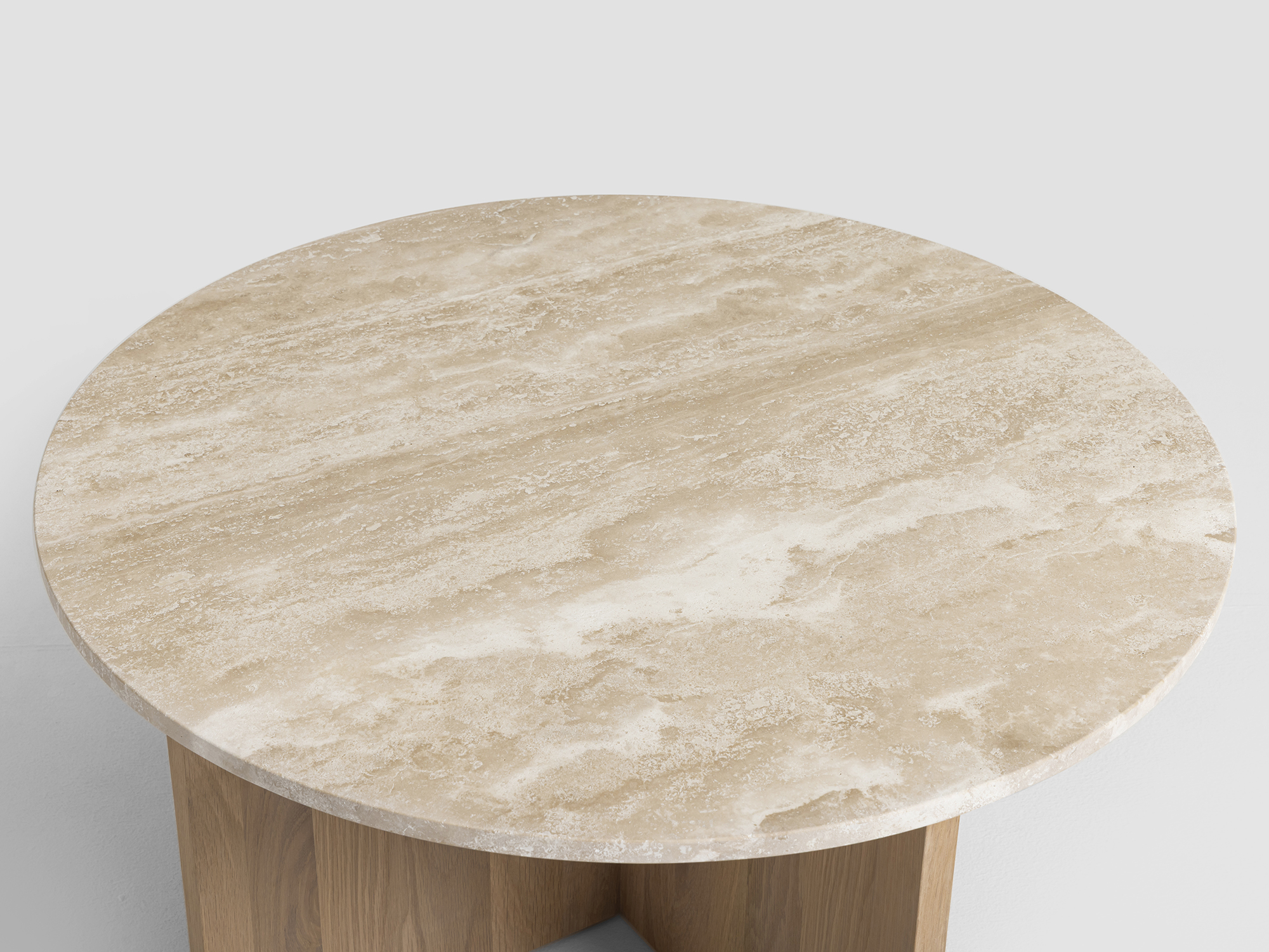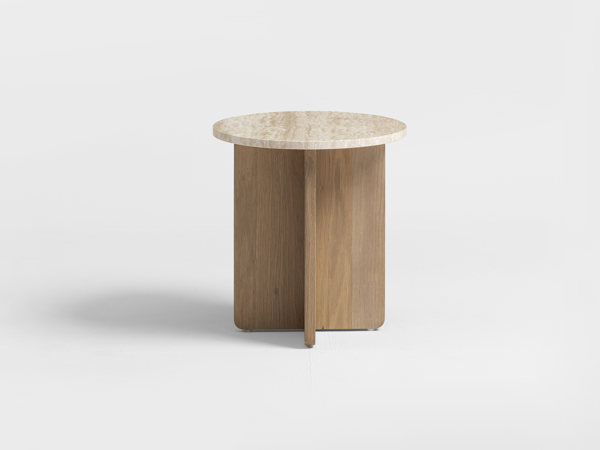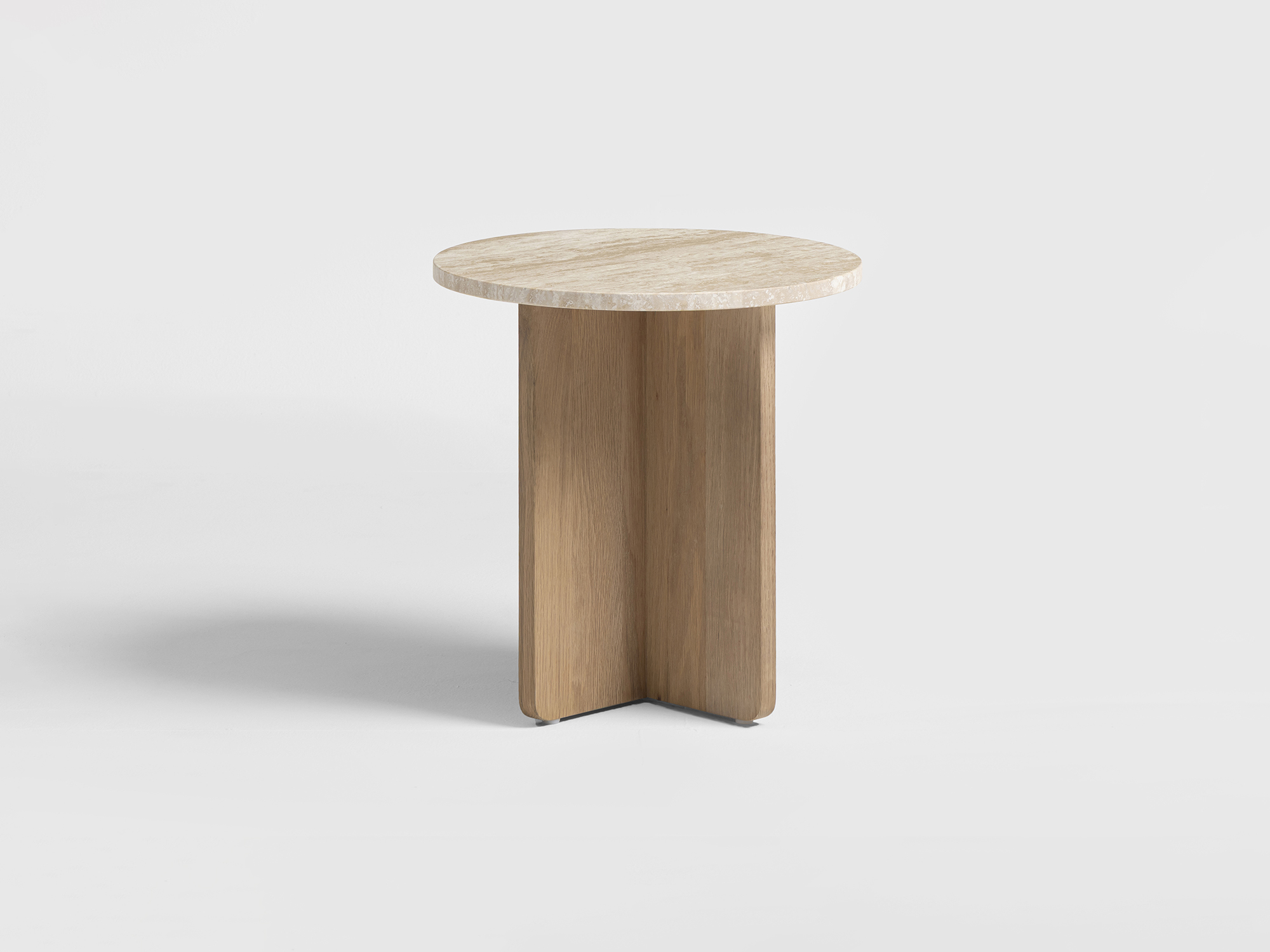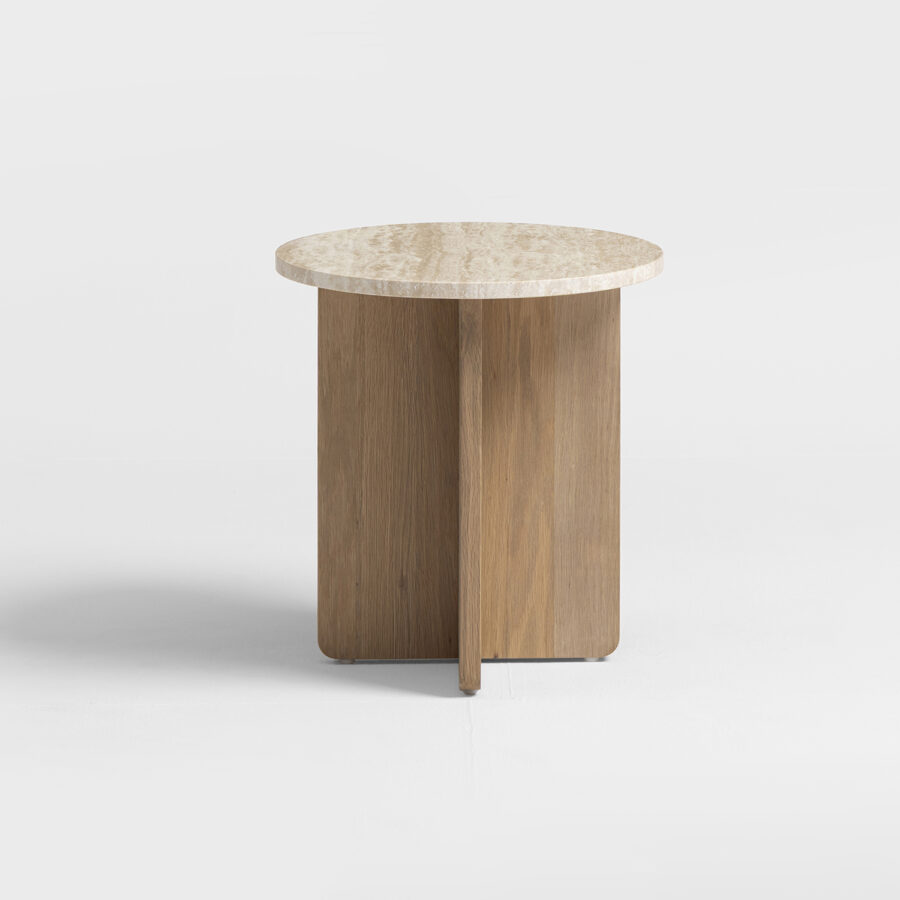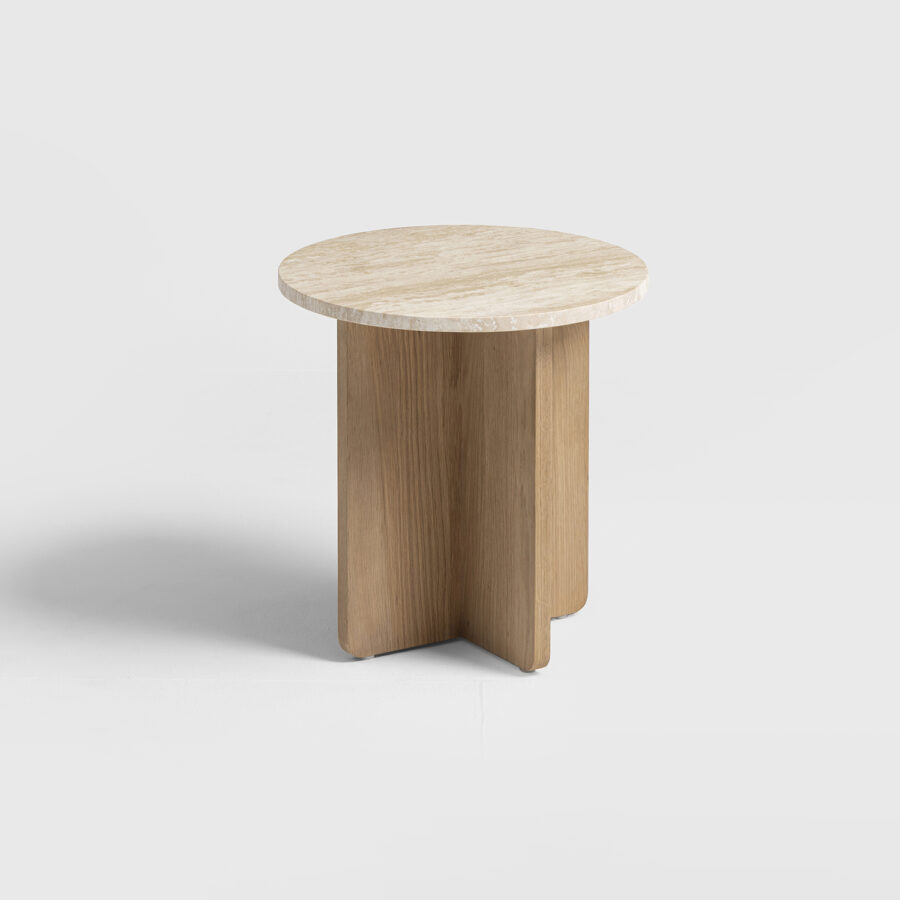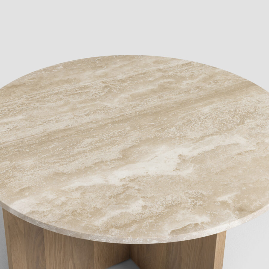 Det här sidobordet är en kombination av skandinavisk design, enkelhet och funktionalitet. Med sina rena linjer och naturliga material uttrycker det här sidobordet en klassisk och tidlös elegans. Travertinskivan i varm, mjuk ton ger bordet karaktär och skapar en harmonisk kontrast mot den naturliga eken.